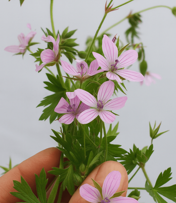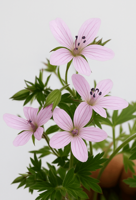 Delicate white petals with fine purple veins, from a mound of green/bronze foliage.