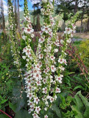 Spikes of lilac flowers on top of a scaffolding of mid-green leaves all the way up the stem. Very tall perennial, excellent at the back of borders.
