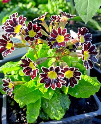 A perennial black-brown variety with scalloped silver margins. Lovely next to a path or as a flowering pot plant.