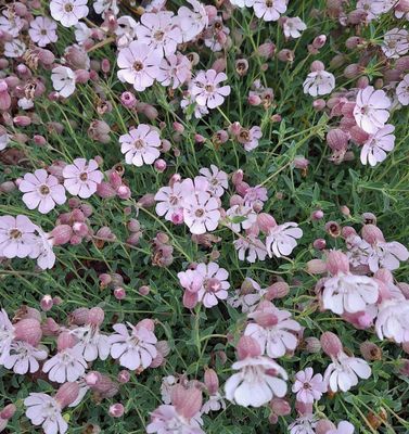 Silene uniflora is a low-growing, mat-forming perennial ideal for dry, coastal, or rocky sites. It produces dainty, five-petalled white flowers, often tinged with pale pink, from late spring through early summer. These blooms sit atop trailing stems and silvery-green foliage, offering a soft contrast to stone or gravel. Native to sea cliffs and dunes of Europe, this plant naturally tolerates salt spray and thrives in well-drained soils, making it especially useful for challenging coastal gardens or dry landscapes. Its tidy, spreading habit works well as ground cover in sunny borders or rockeries.