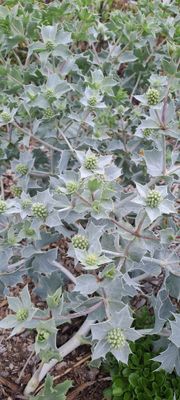 Eryngium maritimum, commonly known as sea holly, is a tough, architectural perennial that thrives in coastal conditions. Its striking blue-green, spiny foliage forms a compact mound, and in summer it produces sculptural, thistle-like flower heads in shades of silvery blue to steely violet, framed by jagged bracts. These blooms are rich in nectar and highly attractive to bees and butterflies. Adapted to sandy, nutrient-poor soils and salt-laden winds, this hardy plant brings a bold, textural element to dry, exposed settings. Despite its prickly demeanour, it is a favourite of pollinators and gardeners alike, and has been traditionally used in herbal medicine and even candied as a delicacy in historical Europe. It makes a great cut flower.